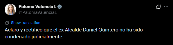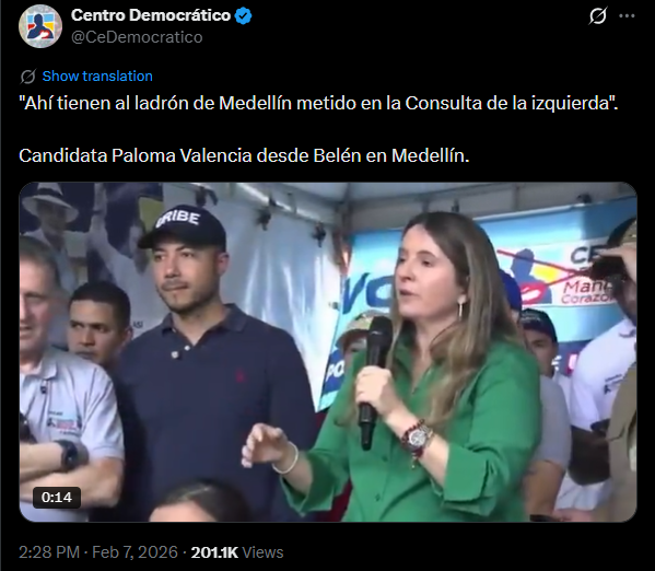 En un tuit del Centro Democrático del pasado 7 de febrero se posteó un video en el que en un acto de campaña Valencia se refería a Daniel Quintero como ladrón metido en la consulta de la izquierda “Ahí tienen al ladrón de Medellín metido en la Consulta de la izquierda”, sin ninguna prueba de sus afirmaciones y sin ningún proceso penal en firme.