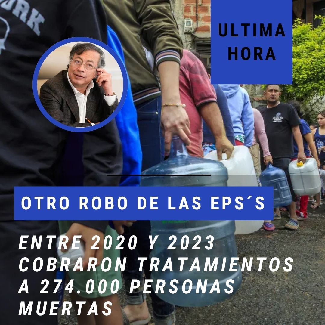 El presidente Petro denunció un nuevo robo de las EPS´s a los colombianos. Según la denuncia por lo menos se habrían cobrado tratamientos a 274.000 personas muertas y además para los muertos pagaron medicamentos con valores por encima del Precio Máximo de Venta ( PMV ) 2019-2023, por valor de $1.422.599.038.171.