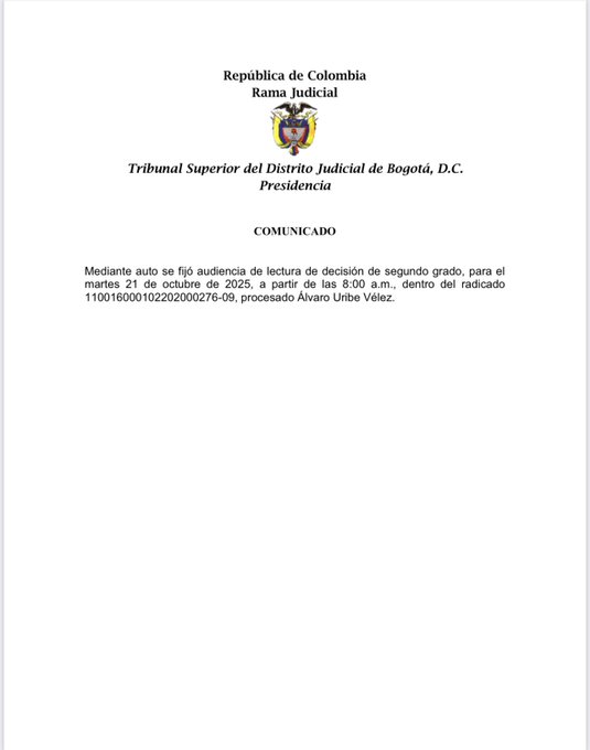 El Tribunal Superior de Bogotá hará lectura de su decisión en torno a la impugnación presentada por la defensa de Álvaro Uribe. El alto Tribunal fijó la lectura del fallo para hoy 21 de Octubre y muy probablemente ratificará la sentencia dictada por la jueza Sandra Heredia en contra del ex senador por manipulación de testigos y fraude procesal a 12 años de prisión.