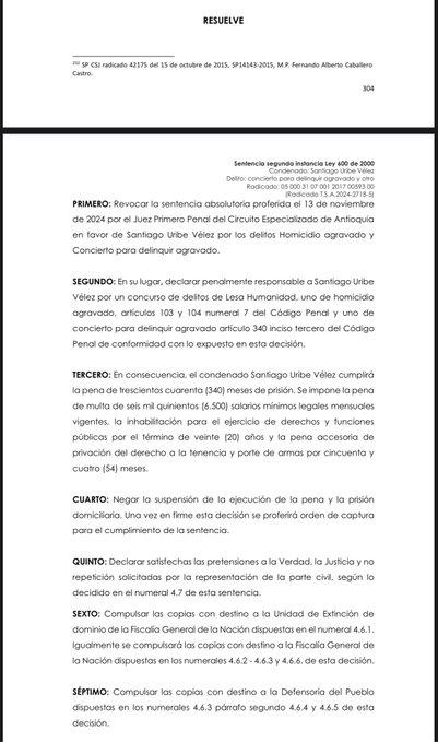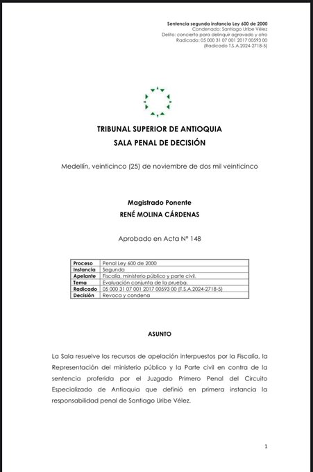 [13:19, 25/11/2025] alexander: El hermano del expresidente Álvaro Uribe Vélez Santiago Uribe fue condenado a 340 meses de prisión por el tribunal superior de Antioquia por hecho relacionados con asesinatos masacres y la creación de grupos paramilitares como los doce apóstoles. Según el tribunal Uribe fue responsable de asesinato y concierto para delinquir agravado.